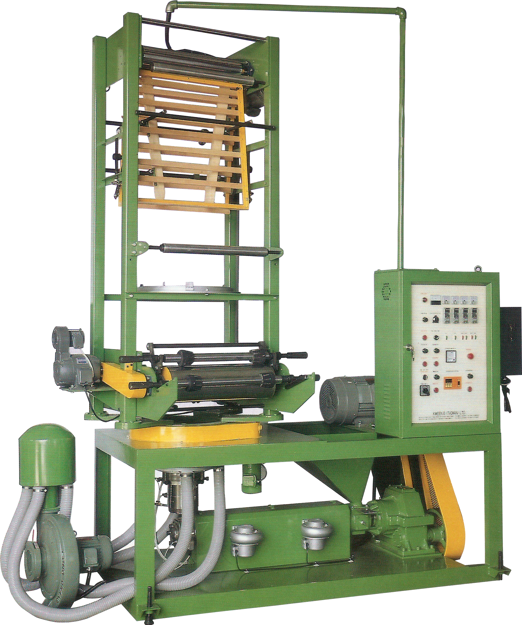 Kween B's OM Series BLOWN FILM LINE is compact, economical and user-friendly machine, ideal for producing narrow film in LDPE,LLDPE and HDPE. The tower oscillates to ensure the manufacture of perfectly flat reels of film, to allow the film to unwind easily when converting into bags or printing on them Whilst a compact machine, it is manufactured to a high specification to be reliable and efficient for consistently reliable production of PE blown film. The OMC Series is a co-extrusion version of the OM with two extruders and the same oscillating tower |